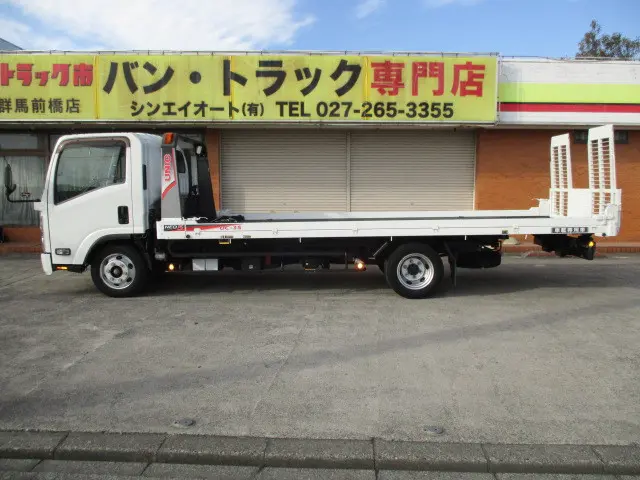 2.9t積 積載車 重機運搬車 ウインチ ラジコン ナビ リア道板オート開閉式 サイドアオリ開きます 支柱取り外し可能 いすゞエルフのOEM車 車両総重量7305Kg